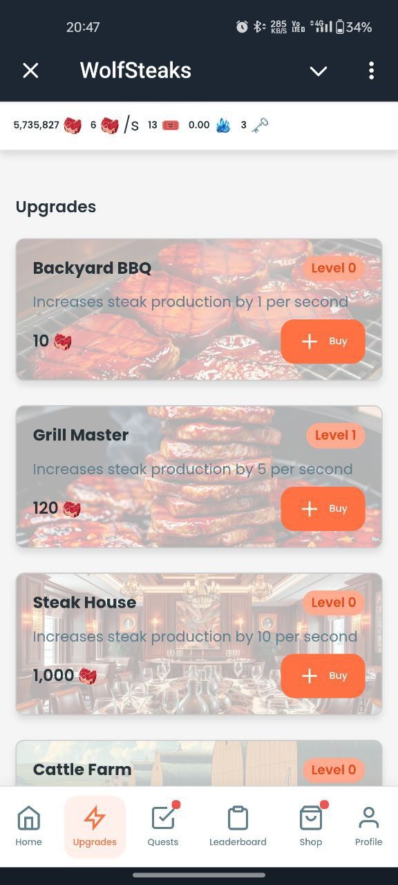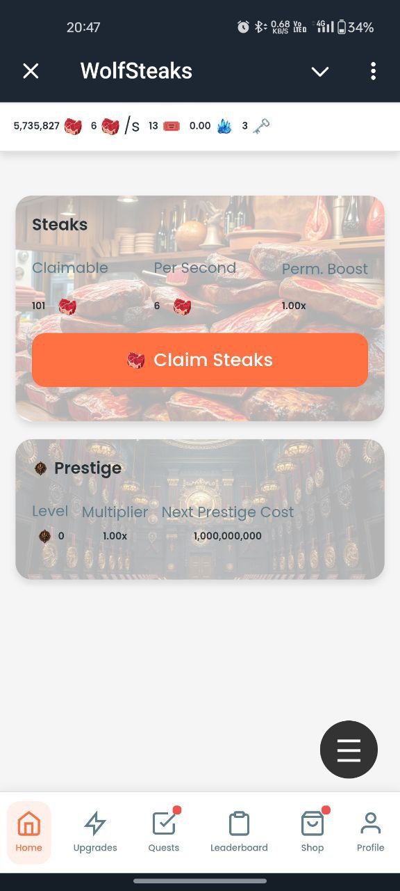 Зарабатывайте стейки, покупайте улучшения и достигайте более высоких уровней престижа, чтобы подняться в таблице лидеров. Вращайте колесо, открывайте коробки с тайнами и фрагментами, чтобы заработать ТОННЫ, и приглашайте своих друзей, чтобы получить комиссию до 10 % за каждую покупку.